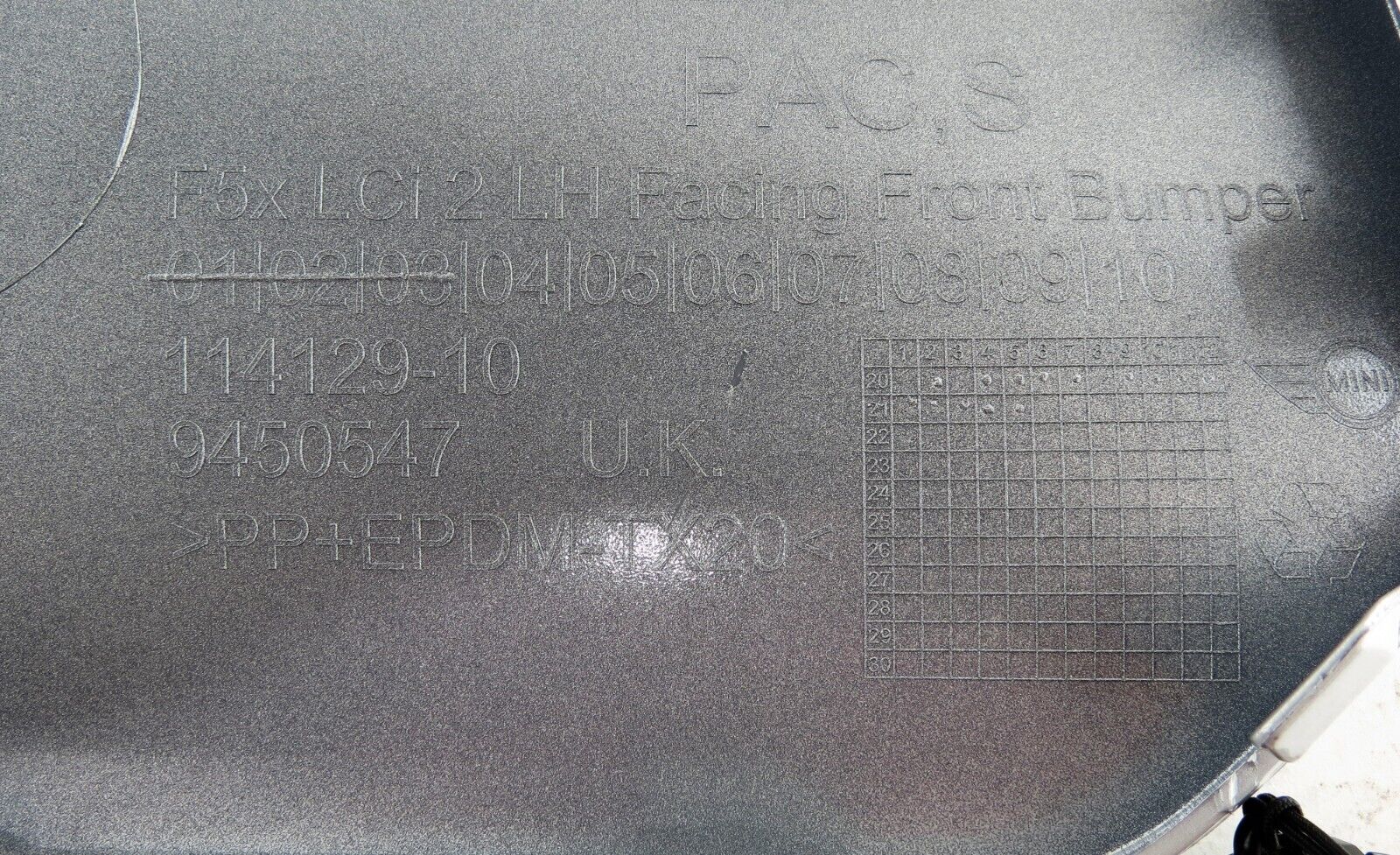 9450547 Mini Cooper/ S LCi 2 Left Side Front Bumper Facing Trim Moonwalk Grey