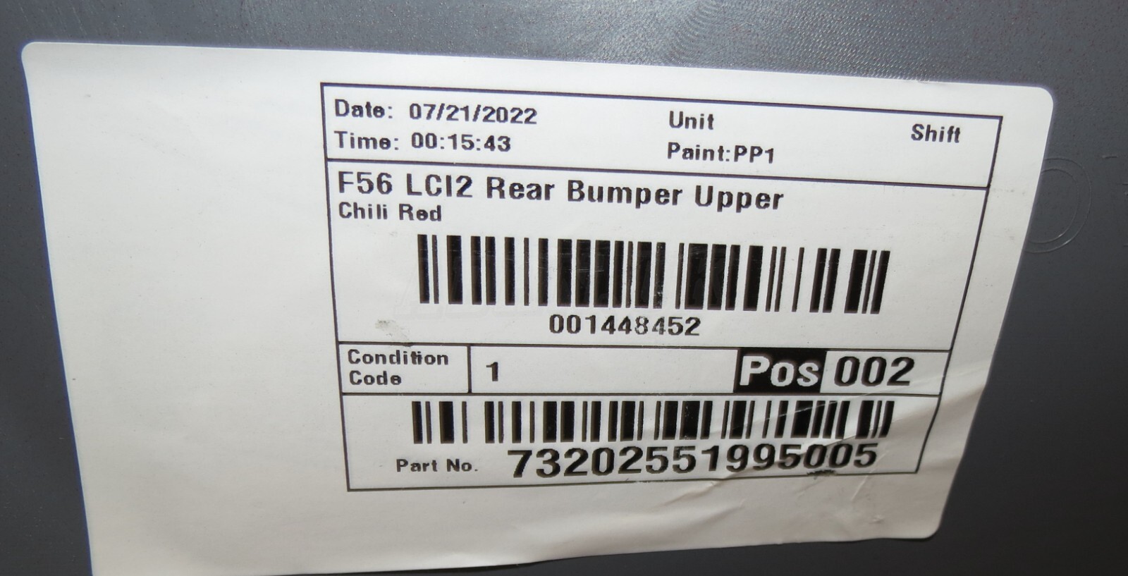 ▓ Stock Ref: Bumper 169 Fits: Mini Mini — F56 Mini Mini — F57 Descriptions & Specifications: Rear Complete Bumper finished in Chili Red, 4 PDC hole, Eye Towing Cover is included. Cooper S Classic and Executive Variants, Diffuser has got no fog light holder. Dispatch: Same Working Day.